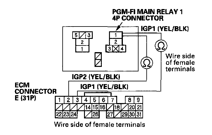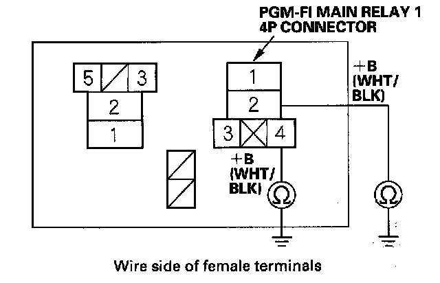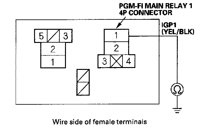 18. Check for continuity between body ground and PGM-FI main relay 1 4P connector terminals No.2 and No.4 individually.