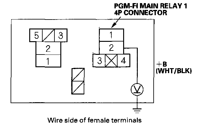19. Disconnect each of the components or connectors connector below, one at a time, and check for continuity between PGM-FI main relay 1 4P connector terminal No.1 and body ground.
