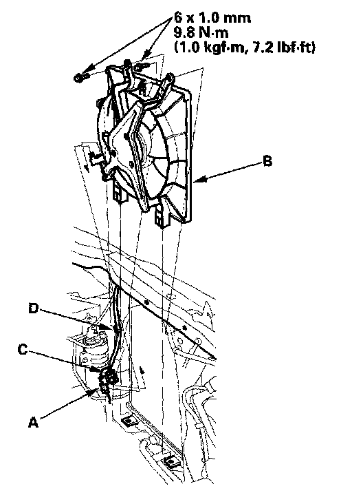 6. Remove the compressor clutch connector (A) from the condenser fan shroud (B), then disconnect the compressor clutch connector. Disconnect the condenser fan connector (C), then remove the wire harness clip (D) from the condenser fan shroud. Remove the mounting bolts and the condenser fan shroud. Be careful not to damage the radiator fins when removing the condenser fan shroud.