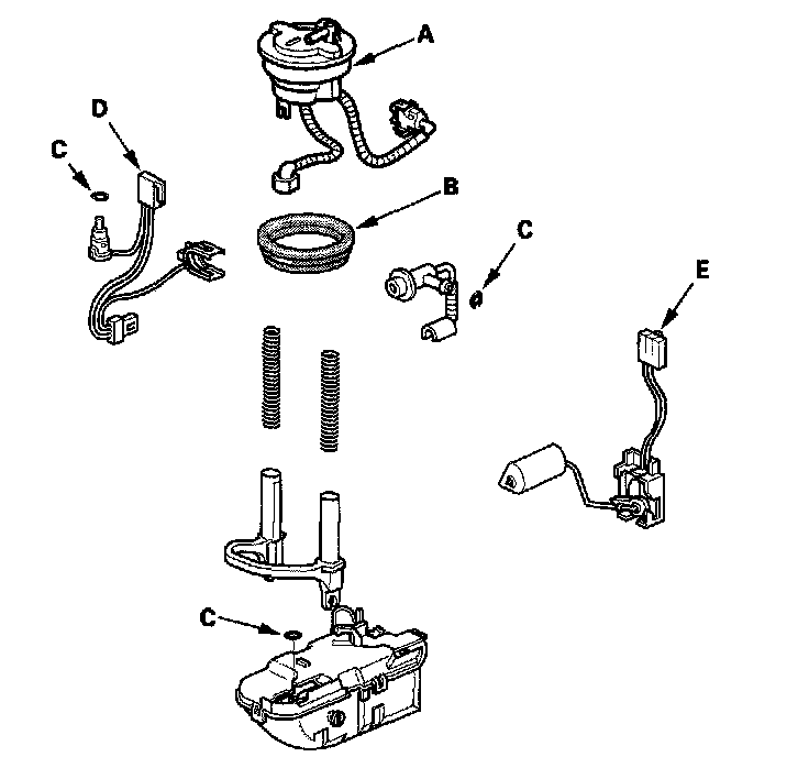 - When installing the fuel gauge sending unit (E), make sure the connection is secure and the connector is firmly locked into place. Be careful not to bend or twist it excessively.