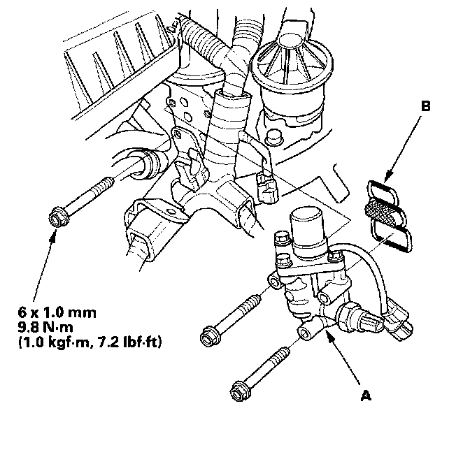 4. If the resistance is within specifications, remove the VTEC solenoid valve assembly (A) from the cylinder head, and check the filter (B) for clogging. If there is clogging, replace the solenoid valve filter, the engine oil filter, and the engine oil.