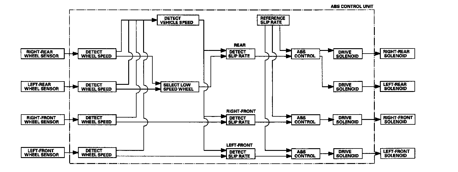 The ABS control unit detects the wheel speed based on the wheel sensor signal it received, then it calculates the vehicle speed based on the detected wheel speed. The control unit detects the vehicle speed during deceleration based on the rate of deceleration.