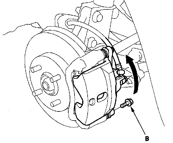 11. Pivot the caliper down into position. Being careful not to damage the pin boots, install the bolt (B), and tighten it to the specified torque.