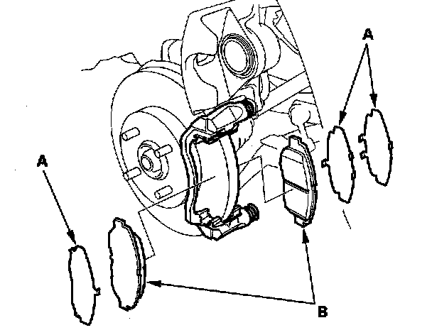 8. Apply Dow Corning Molykote M77 or Daikalub 528D grease to both sides of the pad shim (A), the back of the pads (B), and the other areas indicated by the arrows. Wipe excess grease off the shim. Contaminated brake discs and pads reduce stopping ability. Keep grease off the discs and pads.