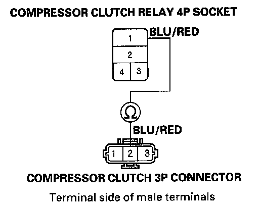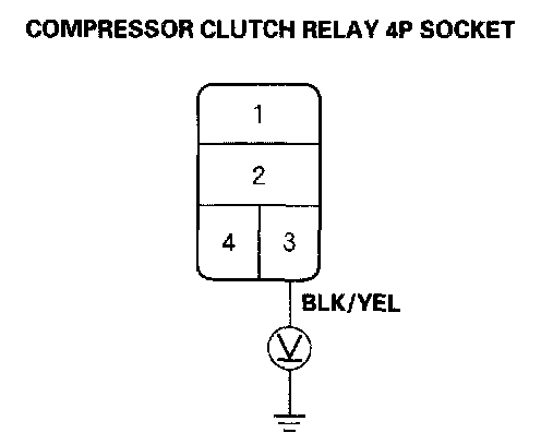 16. Check for continuity between the No.1 terminal of the compressor clutch relay 4P socket and the No.1 terminal of the compressor clutch 1P connector.