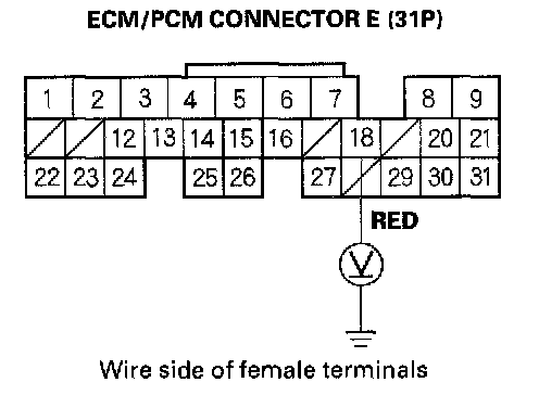 13. Using the Backprobe Set, measure the voltage between the No.18 terminal of ECM/PCM connector E (31P) and body ground with the ECM/PCM connectors connected.