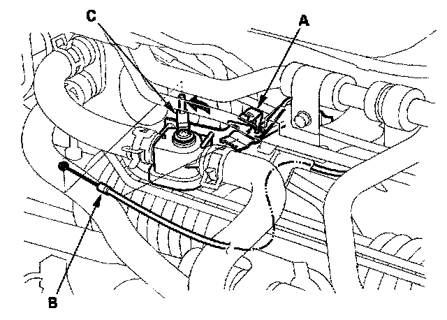 4. From under the hood, open the cable clamp (A), then disconnect the heater valve cable (B) from the heater valve arm (C). Turn the heater valve arm to the fully opened position as shown.