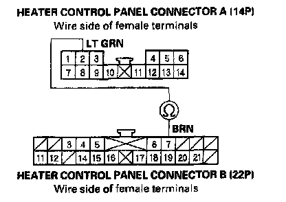 12. Measure the resistance between the No.2 terminal of the heater control panel connector A (14P) and the No. 7 terminal of the heater control panel connector B (22P).