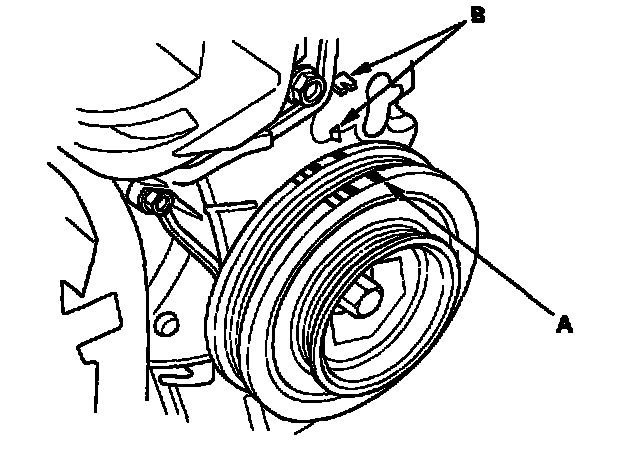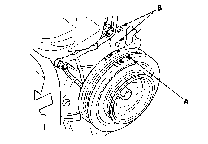 3. Turn the crankshaft pulley so its Top Dead Center (TDC) mark (A) lines up with the pointers (B).