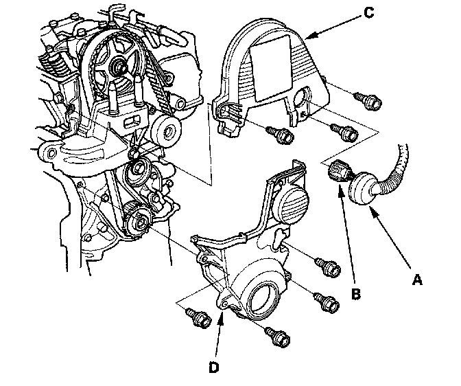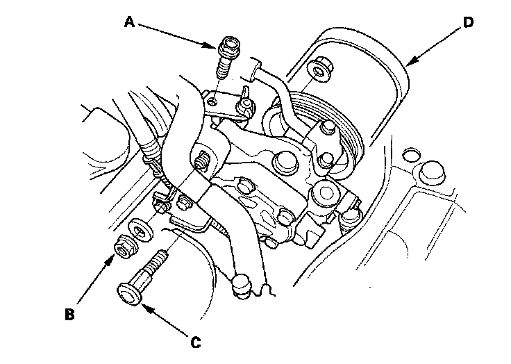 6. Remove the adjust plate mounting bolt (A), locknut (B) and mounting bolt (C), then remove the power steering (P/S) pump belt (D) and pump without disconnecting the P/S hoses.