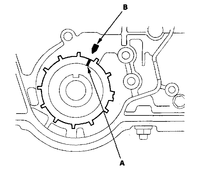 2. Set the crankshaft to top dead center (TDC). Align the TDC mark (A) on the timing belt drive pulley with the pointer (B) on the oil pump.