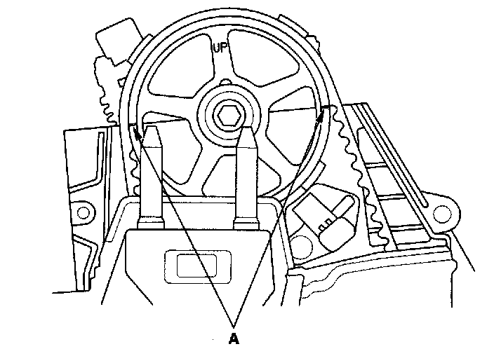 -1 The "UP" mark (A) on the camshaft pulley should be at the top.