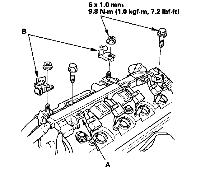 9. Remove the throttle cable clamps (A) and harness holder (B) from the cylinder head cover.
