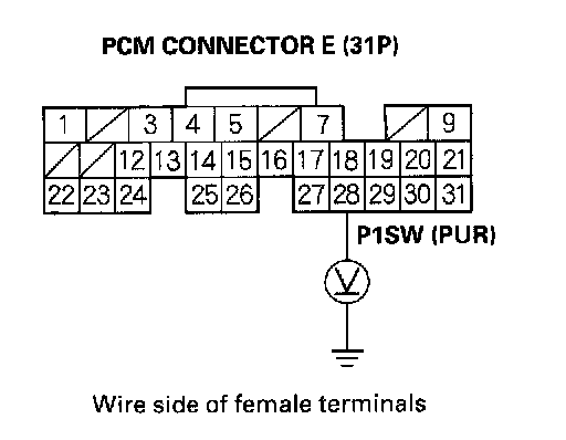 6. Measure voltage between PCM connector terminal E28 and body ground.
