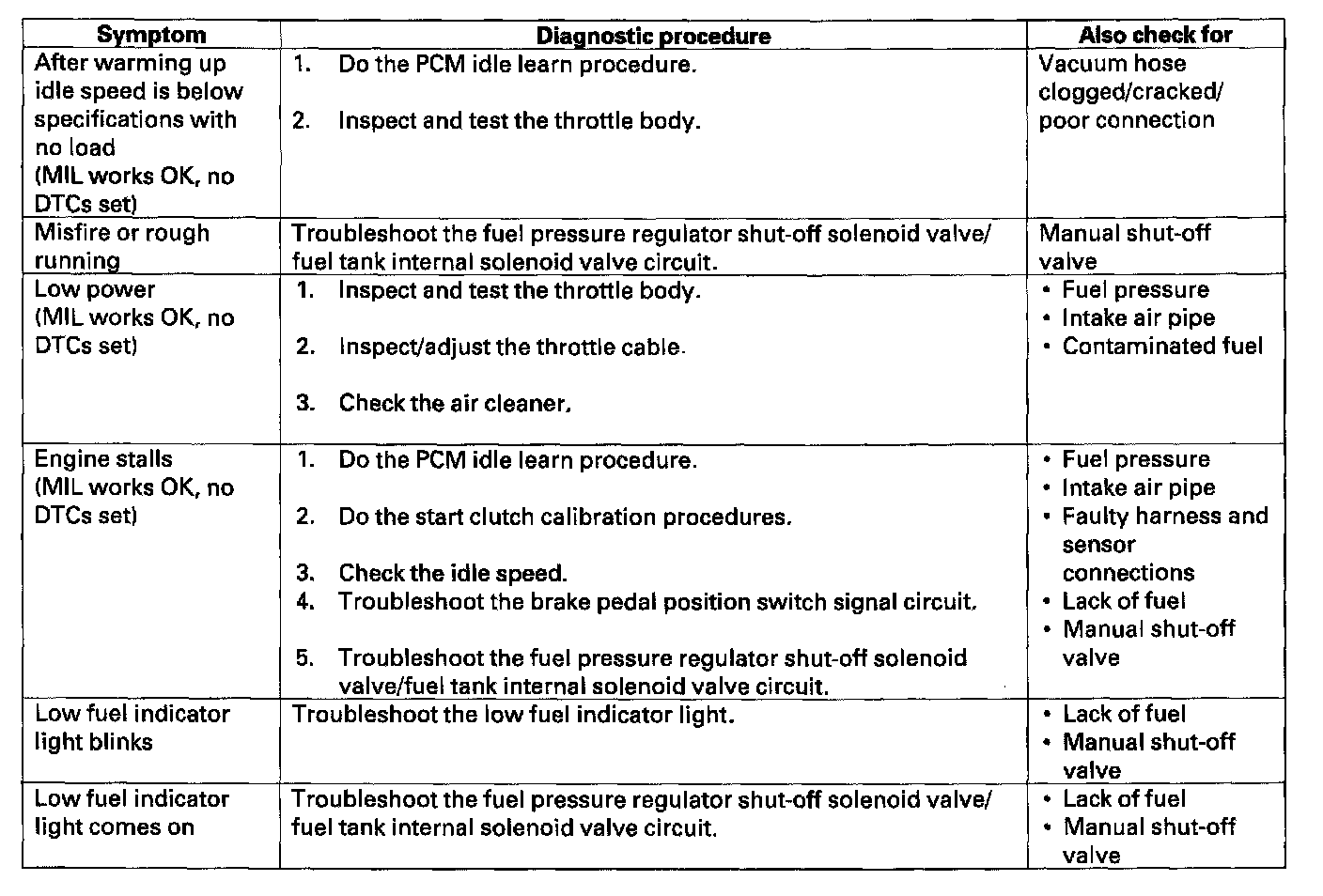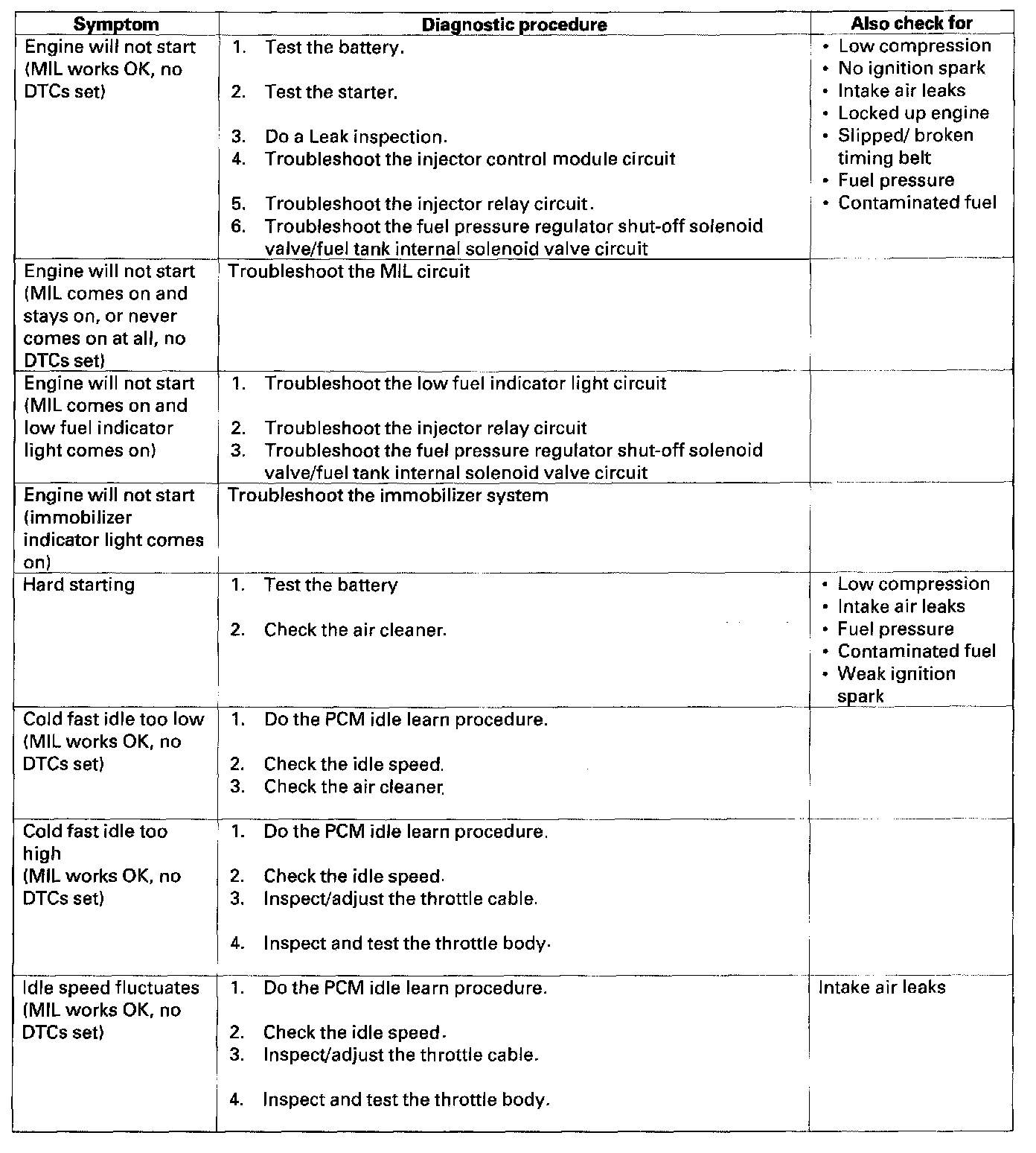 When the vehicle has one of these symptoms, check the Diagnostic Trouble Code (DTC) with the scan tool. If there is no DTC, do the diagnostic procedure for the symptom, in the sequence listed, until you find the cause.