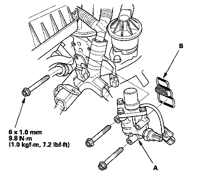 4. If the resistance is within specifications, remove the VTEC solenoid valve assembly (A) from the cylinder head, and check the VTEC solenoid valve filter (B) for clogging. If there is clogging, replace the solenoid valve filter, the engine oil filter, and the engine oil.