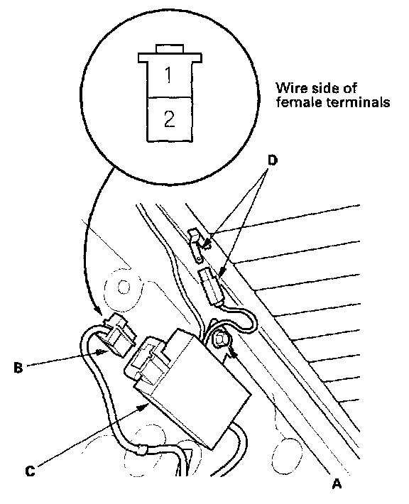 9. Check for continuity between the rear window defogger negative terminal (A) connector and body ground. There should be continuity.