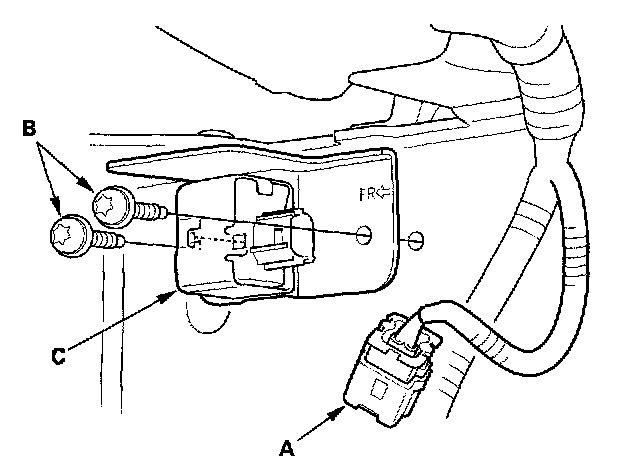 1. Install the new front impact sensor with new Torx bolts (A), then connect the engine compartment wire harness 2P connector (B) to the front sensor (C).