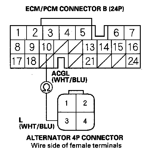 10. Check for continuity between ECM/PCM connector terminal B10 and alternator 4P connector terminal No. 3.