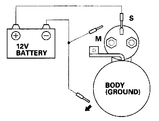 3. Connect the battery as shown. Be sure to disconnect the starter motor wire from the solenoid. If the starter pinion moves out, it is working properly.