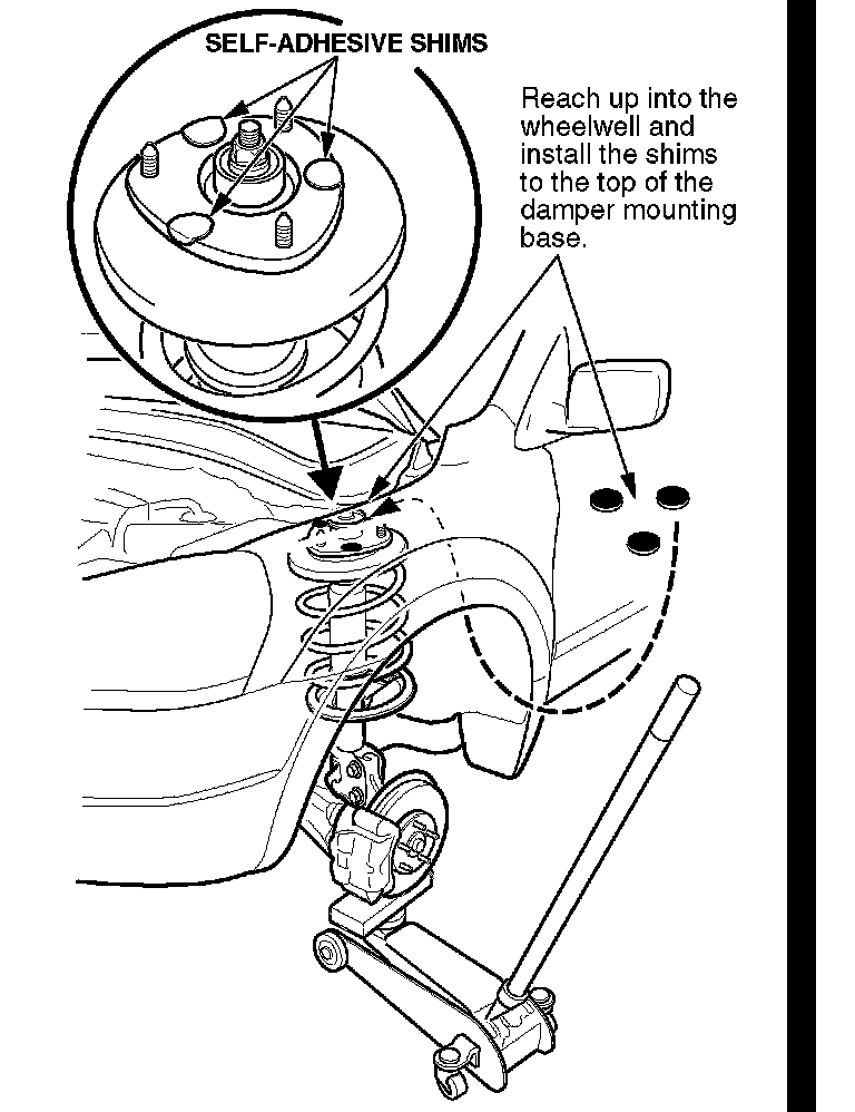Install shims to the damper mounting base and/or remove the front damper/spring assembly, grind off the body spot weld burrs, and refinish the surface.