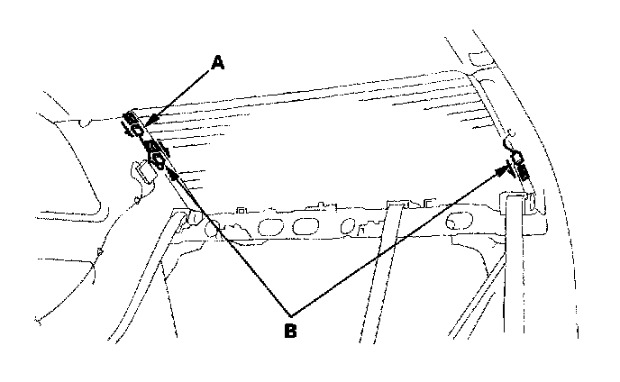 11. Attach the clips (A) with adhesive tape to the inside face of the rear window (B) as shown: