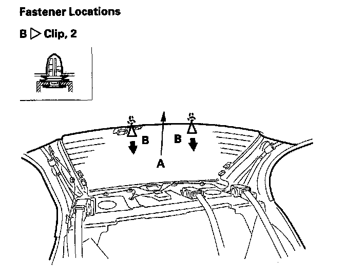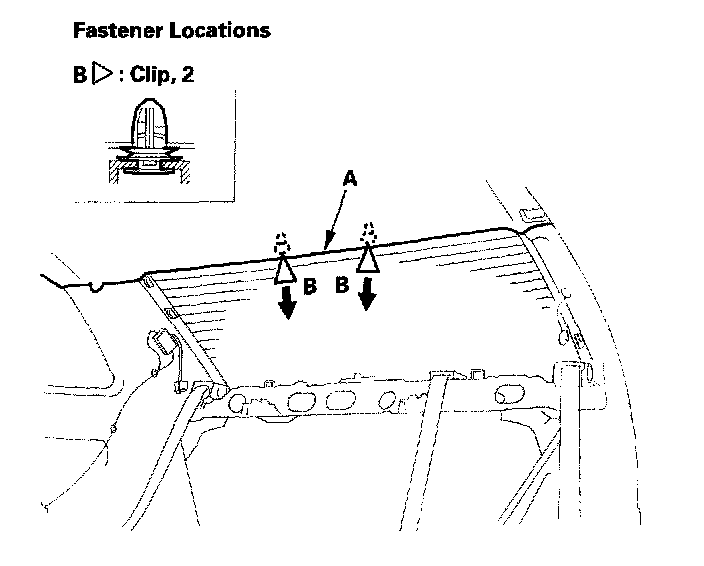 4. Pull down the rear portion of the headliner (A) by detaching the clips (B). Take care not to bend the headliner excessively, or you may crease or break it.