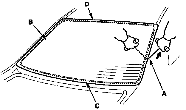 - If the rear window is to be reinstalled, take care not to damage the molding (D).