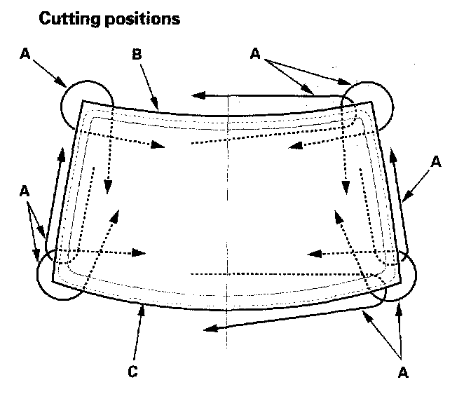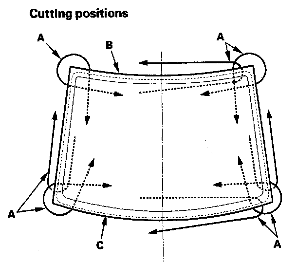 7. With a helper on the outside, pull the piano wire (A) back and forth in a sawing motion. Hold the piano wire as close to the rear window (B) as possible to prevent damage to the body, and carefully cut through the adhesive (C) around the entire rear window.