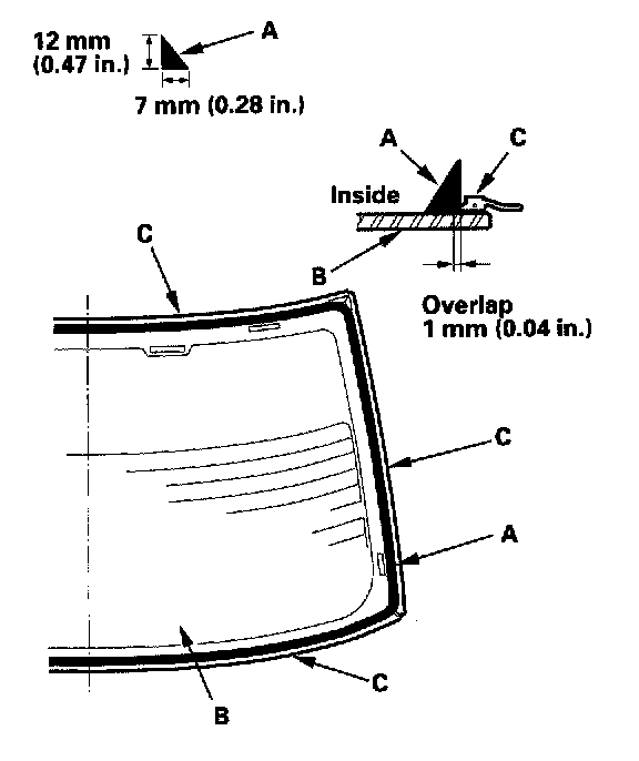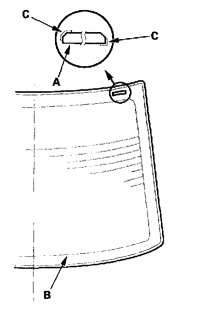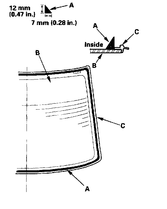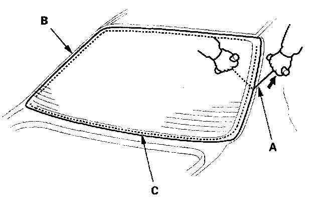 20. Put the cartridge in a caulking gun, and run a bead of adhesive (A) around the edge of the rear window (B) and moldings (C) as shown. Apply the adhesive within 30 minutes after applying the glass primer. Make a slightly thicker bead at each corner.