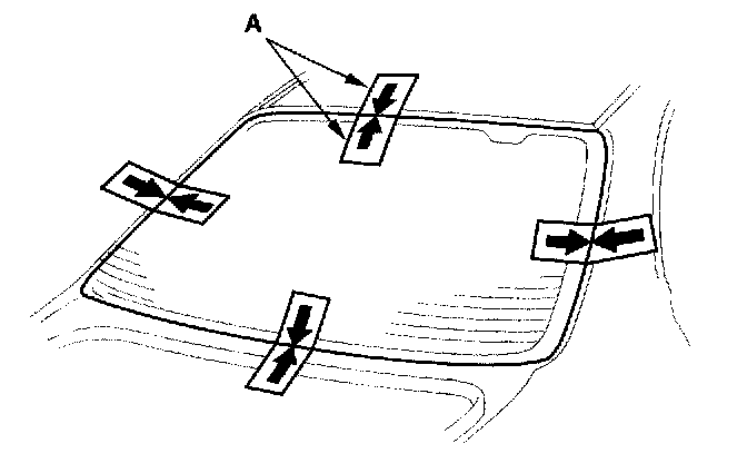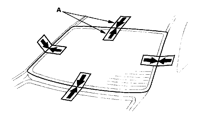 15. Set the rear window in the opening, and center it. Make alignment marks (A) across the rear window and body with a grease pencil at the four points shown. Be careful not to touch the rear window where adhesive will be applied.