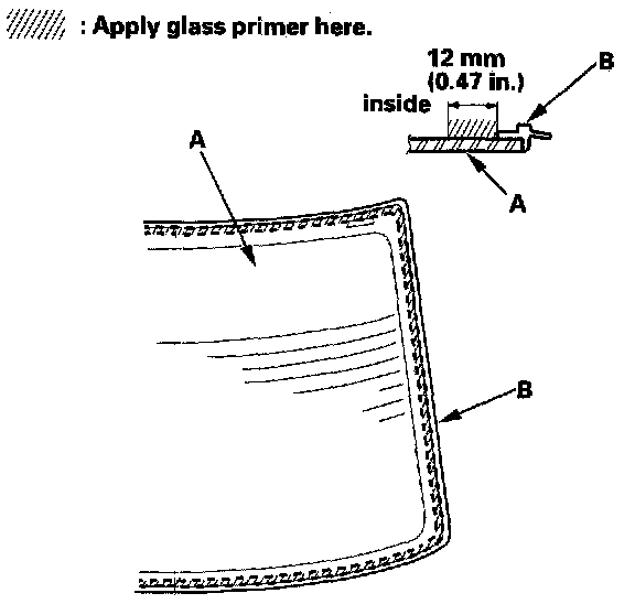15. With a sponge, apply a light coat of glass primer along the edge of the rear window (A) and molding (B) as shown, then lightly wipe it off with gauze or cheesecloth: