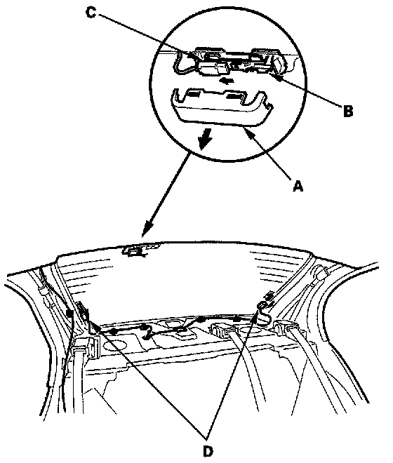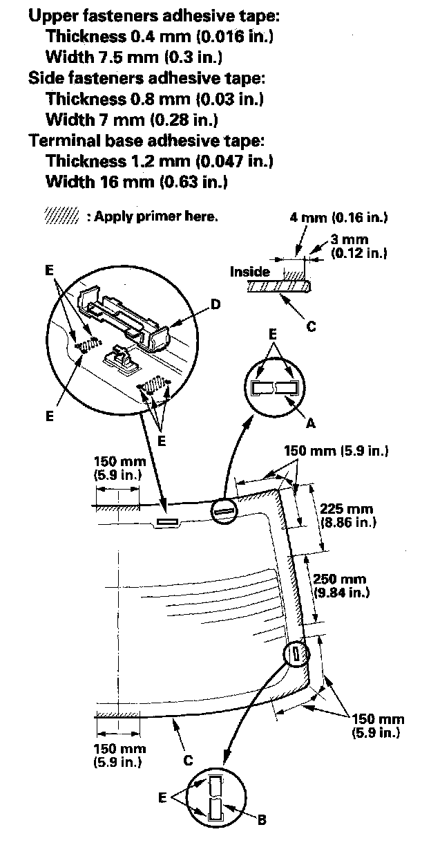 12. Attach the upper fasteners (A) and side fasteners (B) with adhesive tape to the inside face of the rear window-(C) as shown. Apply primer to the inside face of the rear window as shown. If necessary, apply primer to the areas where the window antenna terminal base (D) will be attached, then attach the base with adhesive tape: