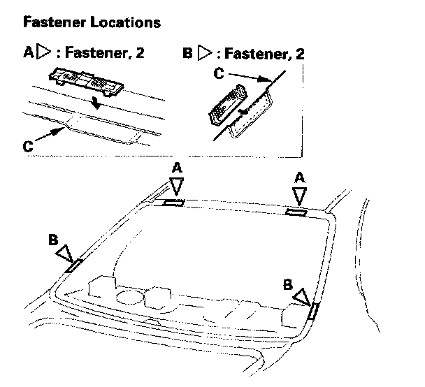 14. Attach the upper fasteners (A) and side fasteners (B) with adhesive tape to the rear window opening flange (C) of the body.