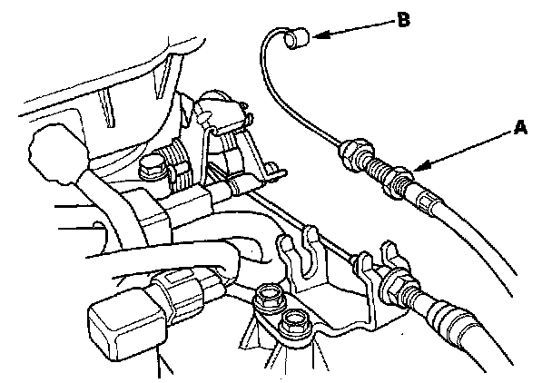 1. Loosen the locknut (A), then disconnect the actuator cable (B) from the throttle linkage.