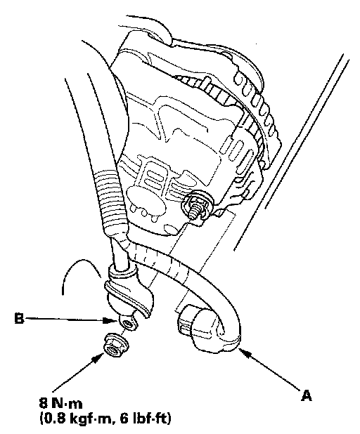 4. Disconnect the 4P connector (A) and alternator cable (B) from the alternator.