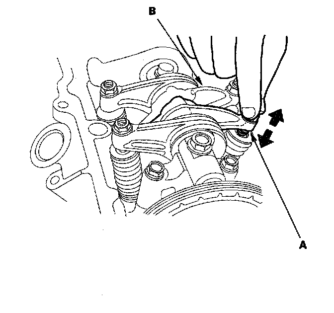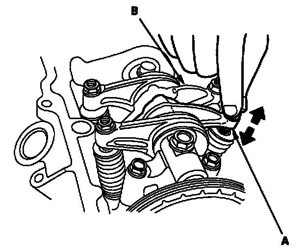 9. With the specified air pressure applied and the piston at TDC, move the primary rocker arm (A). The primary rocker arm and secondary rocker arm (B) should move together. If the primary and secondary rocker arms do not move together, replace the rocker arms as a set.