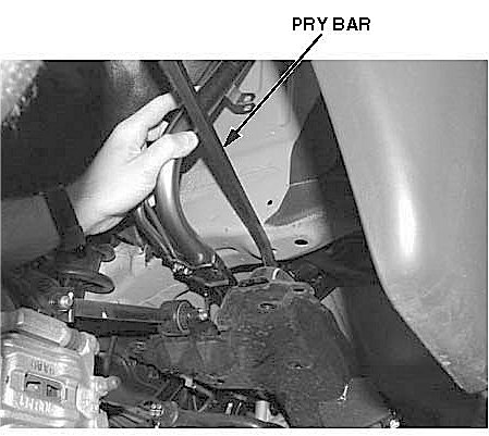 6. Using a pry bar, move the rear cross beam down to make room to remove the fuel fill pipe.