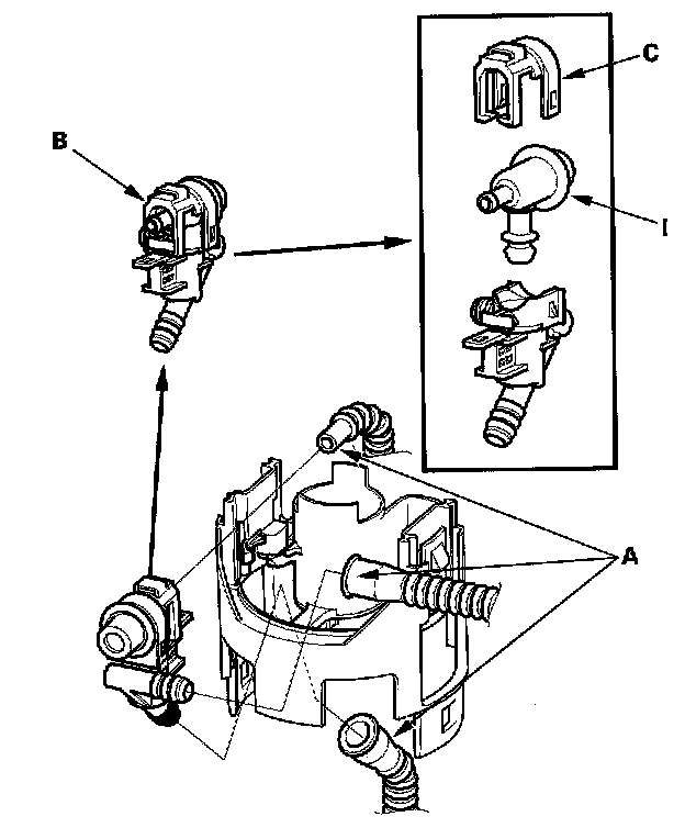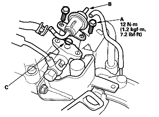 3. Remove the pressure regulator bracket (C) and the fuel pressure regulator (D).