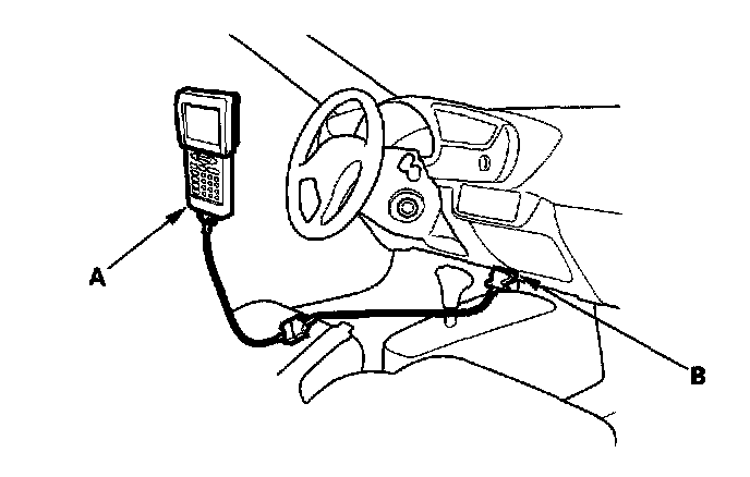 When the data link connector (DLC) (B) (located under the dash behind the center console) is connected to the OBD II Scan Tool or Honda PGM Tester (A), it will indicate the diagnostic trouble code (DTC) when the ignition switch is turned ON (II).