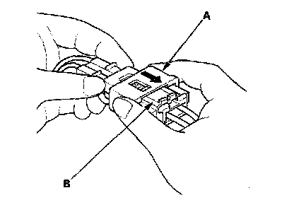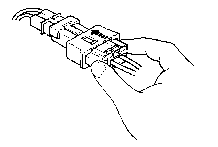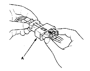 2. To reconnect, hold the pawl-side connector, and press on the back of the sleeve-side connector half in the direction shown. As the two connector halves are pressed together, the sleeve (A) is pushed back by the pawl. Do not touch the sleeve.