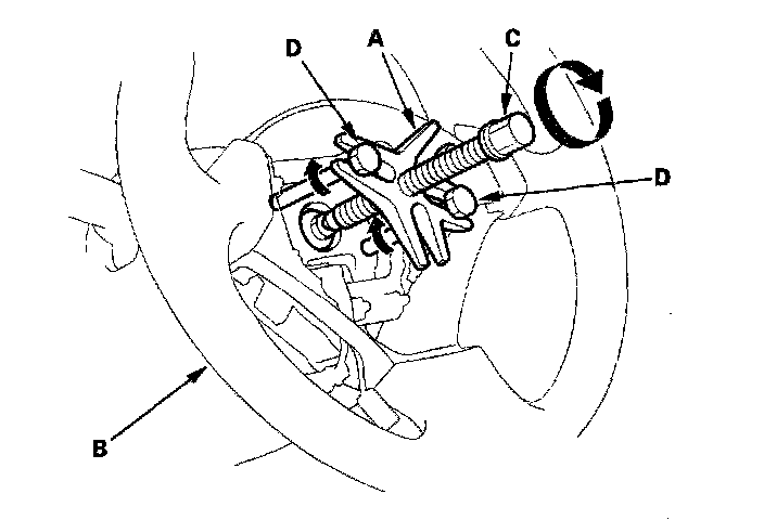 4. Install a commercially available steering wheel puller (A) on the steering wheel (B). Free the steering wheel from the steering column shaft by turning the pressure bolt (C) of the puller.