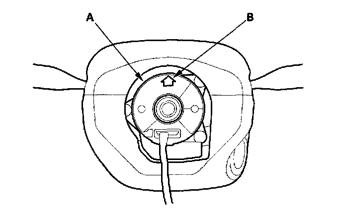 1. Before installing the steering wheel, make sure the front wheels are aligned straight ahead, then center the cable reel (A). Do this by first rotating the cable reel clockwise until it stops. Then rotate it counterclockwise approximately two and half turns. The arrow mark (B) on the cable reel label point should point straight up.