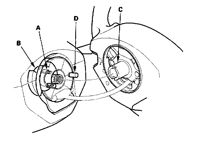 2. Position the two tabs (A) of the turn signal canceling sleeve (B) as shown, and install the steering wheel on to the steering column shaft, making sure the steering wheel hub (C) engages the pins (D) of the cable reel and tabs of the canceling sleeve. Do not tap on the steering wheel or steering column shaft when installing the steering wheel.