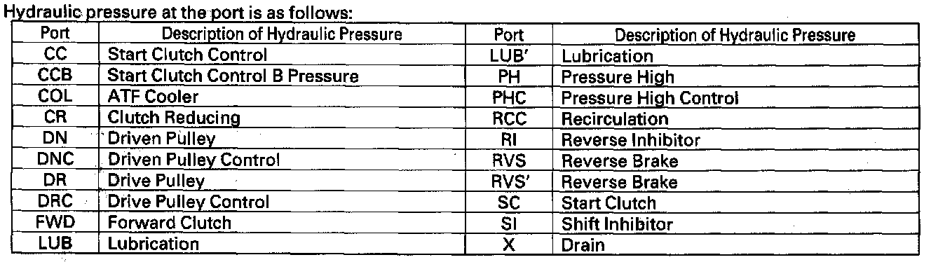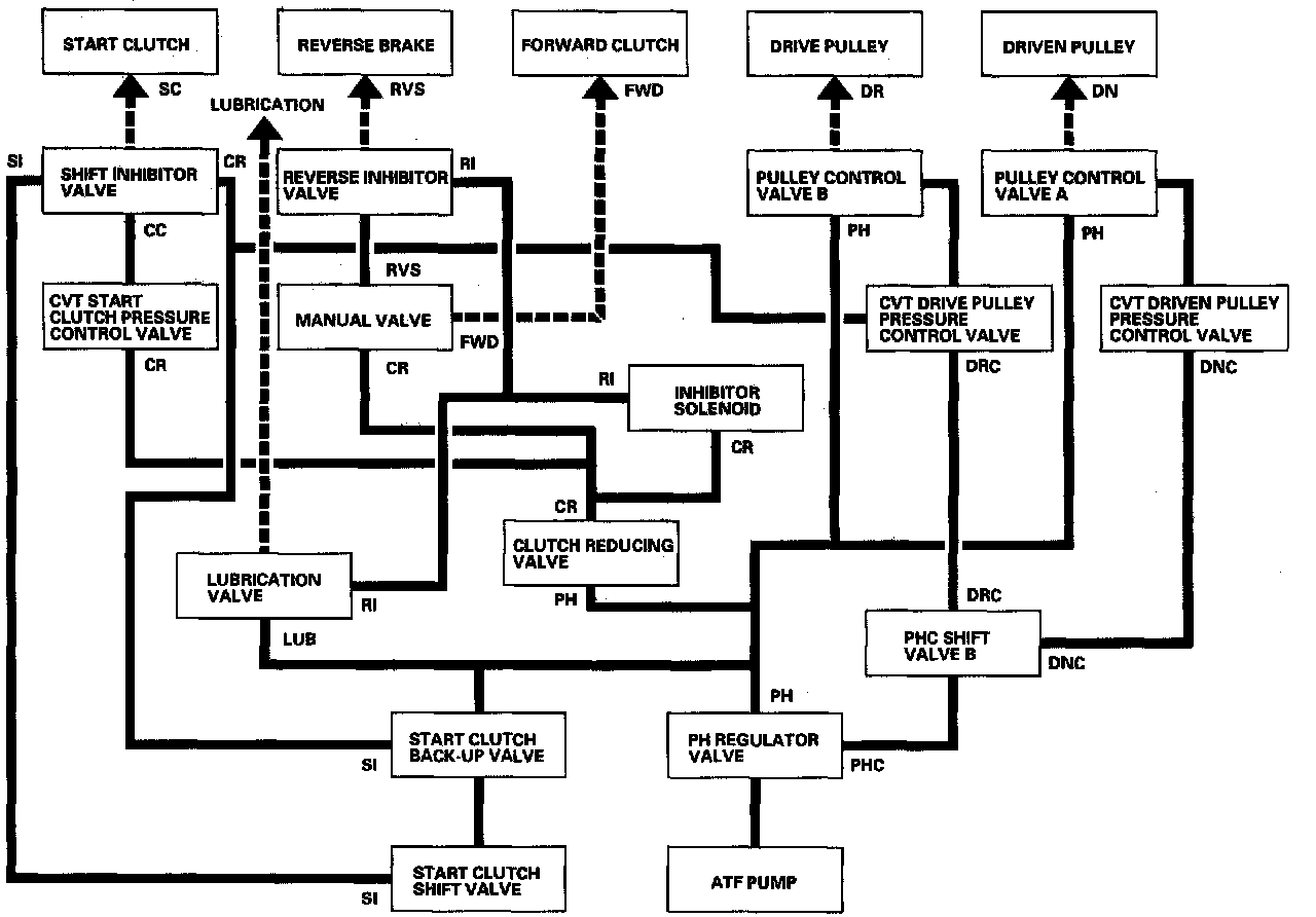 Hydraulic FlowAs the engine turns, the ATF pump starts to operate. Automatic transmission fluid (ATF) is drawn through the ATF strainer and discharge into the hydraulic circuit. Then, ATF flowing from the ATF pump flows to the PH regulator valve and becomes pressure high (PH) pressure. PH pressure flows to the pulley control valves and then to the pulleys. The TCM actuates the solenoids to control hydraulic pressure shifting pulley ratio and engaging the start clutch.