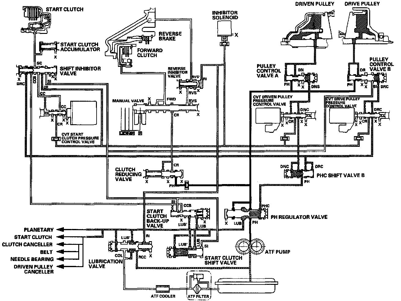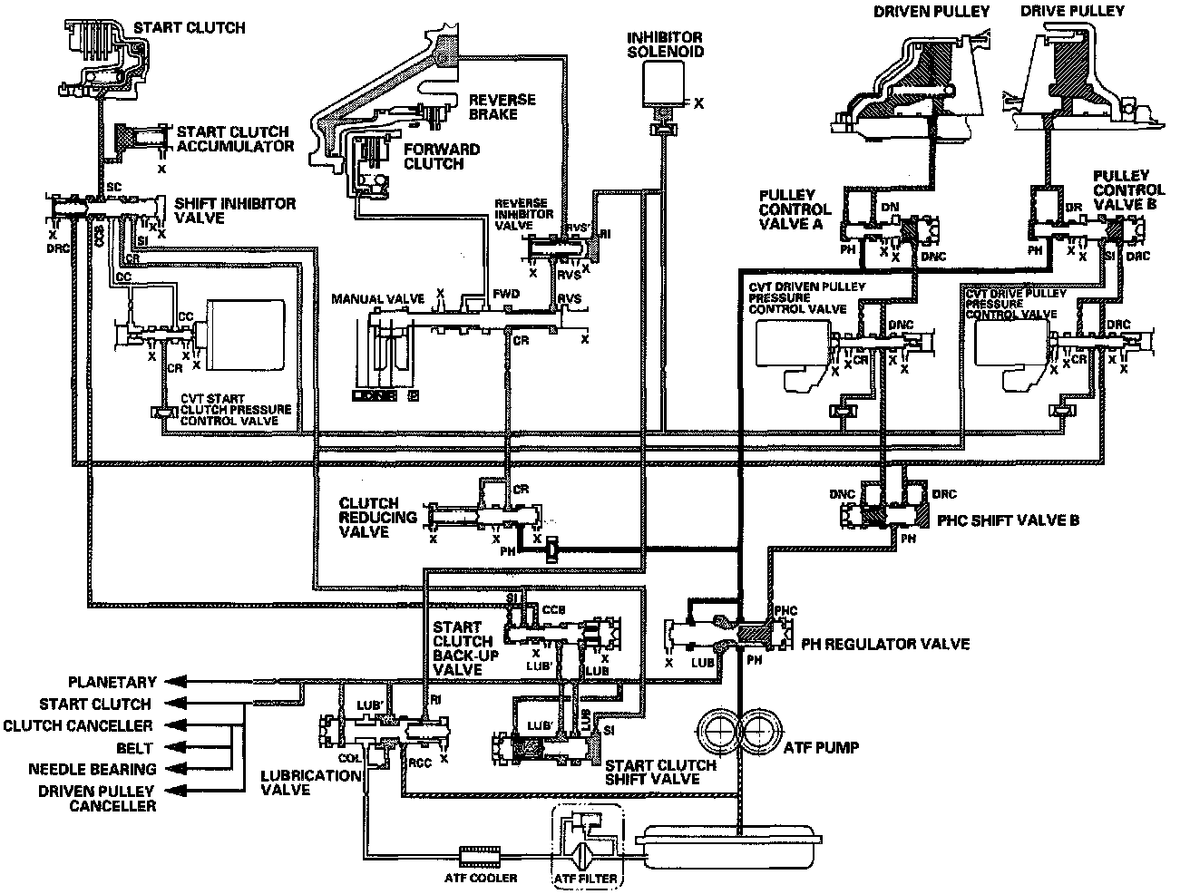 Fluid from the ATF pump is regulated to high pressure at the PH regulator valve, and flows to the pulley control valves. The CVT driven pulley pressure control valve and the CVT drive pulley pressure control valve control the pulley control valves A and B to apply pressure to the pulleys. The driven pulley receives pressure higher than pressure drive pulley receives, but hydraulic pressure to the forward clutch is intercepted by the manual valve and to the start clutch is intercepted by the CVT start clutch pressure control valve. Under this condition, hydraulic pressure is not applied to the start and forward clutches.