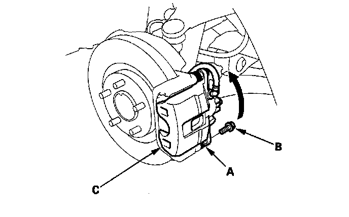 2. Hold the caliper pin (A) with a wrench, being careful not to damage the pin boot. Remove the caliper bolt (B) with another wrench, and pivot the caliper (C) up out of the way. Check the hoses and pin boots for damage and deterioration.