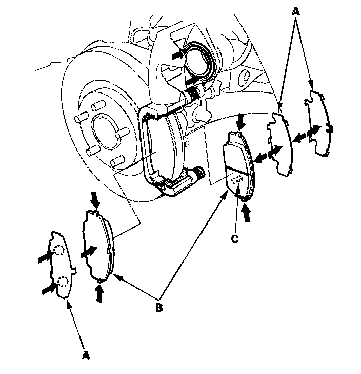 3. Remove the pad shims (A), pad retainers (B), and pads (C).