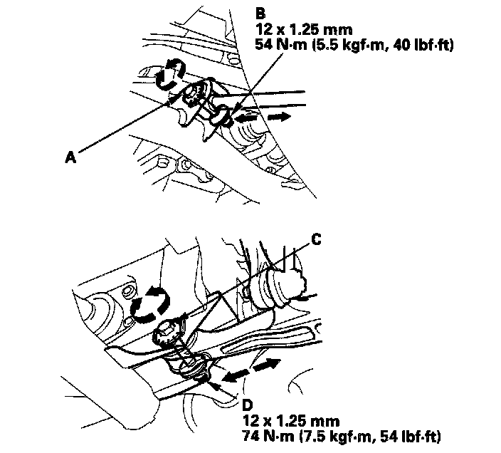 3. Hold the adjusting bolt of the control arm (A), and loosen the self-locking nut (B). Hold the adjusting bolt of the lower arm (C), and loosen the self-locking nut (D).