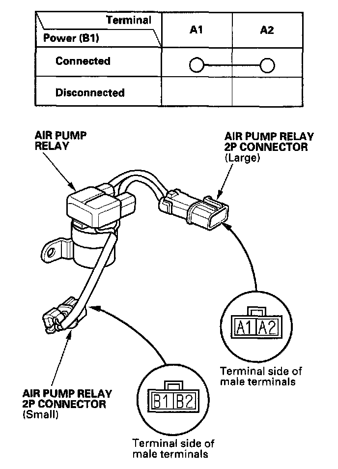 - There should be continuity between the A1 and A2 terminals of the air pump relay 2P large connector when power and ground are connected to the B1 terminal of the air pump relay 2P small connector.